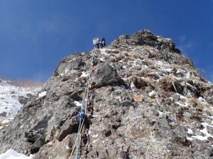 この時点で12時を回っており、時間的にギリギリなので中止か継続か相談をしたが、天気の良さにも後押しされて登攀を継続することにした。