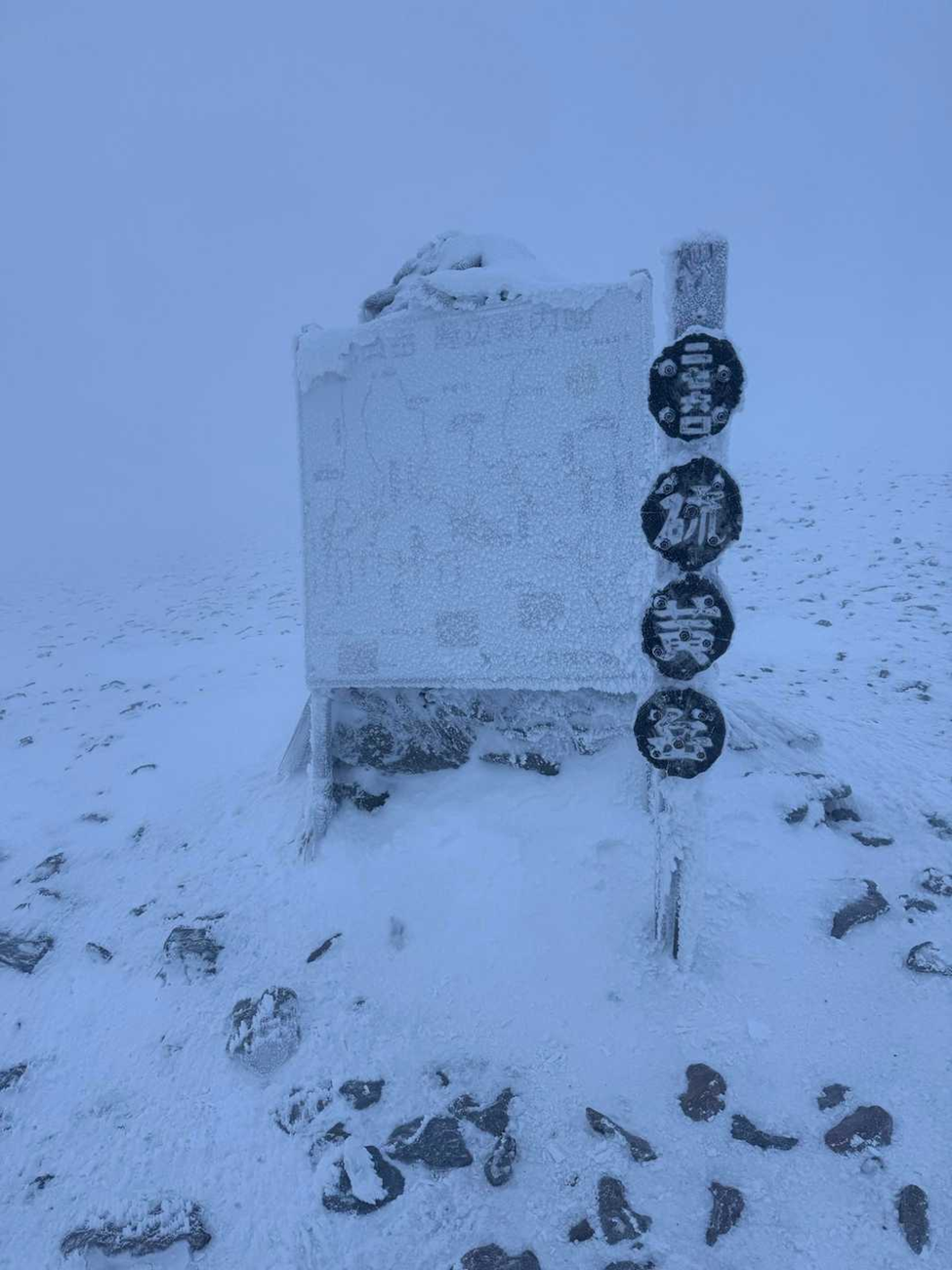 硫黄岳山荘から硫黄岳までは約100mほどの登り返しになりましたが、向かい風に逆らいながら登ったためかなり辛かったです…風が強過ぎて息がうまく吸えなかったのでそれもしんどさに一役買っていたかもしれないです。9時52分に赤岩の頭まで戻りようやく風がおさまりほっと一息つけました。この時すれ違った他の登山者からまつげにつららができていると指摘され、風の威力を実感しました。