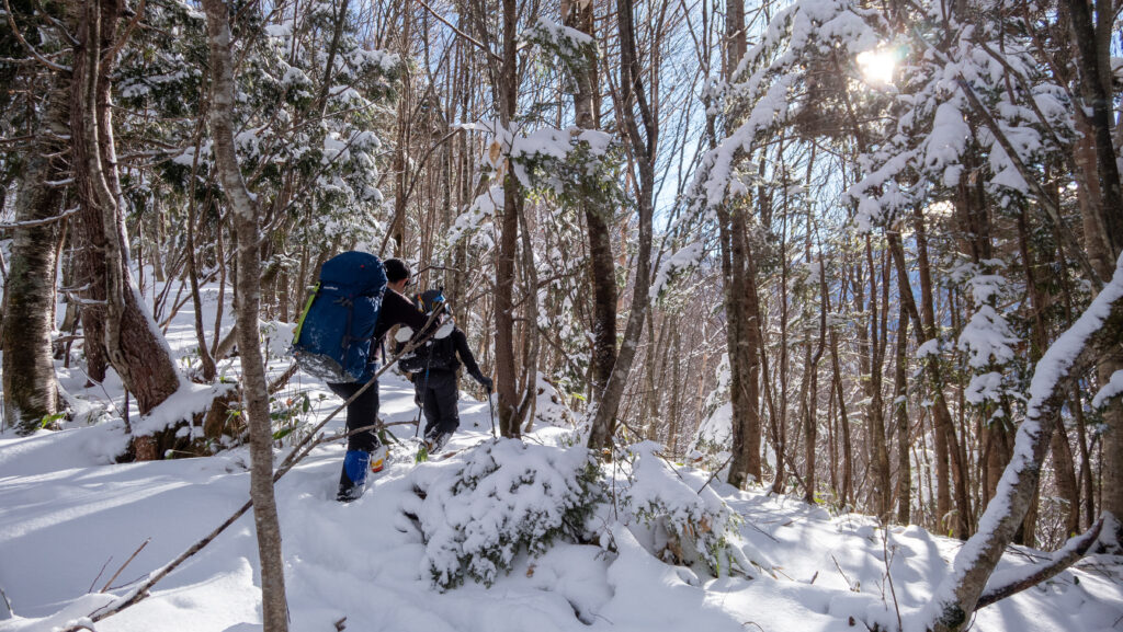 しばらくはうっすらトレースあり。雪が浅く薮が滑るので歩きづらい。徐々に雪が深くなり、先頭を交代しながら2,400mまで詰めて幕営。急登直前のコルは広々しており、正面に笠ヶ岳が見える素敵なテン場だった。
