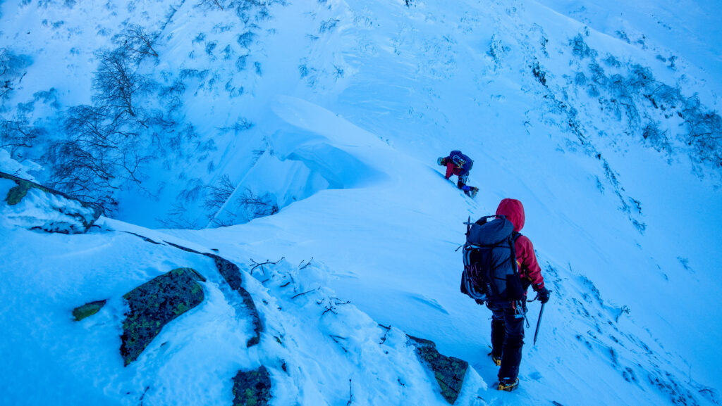 リーゼントみたいに張り出した雪庇を避けて、稜線南側の斜面をトラバースしていく。急斜面な上に踏み抜きのある不安定な雪と、重い荷物でバランスを崩しそうになり緊急した。そしてずっと日の当たらない西尾根は寒い。第二岩峰手前のコルでインサレーションを着込んだ。流石の林さんもダウンを着ていた。