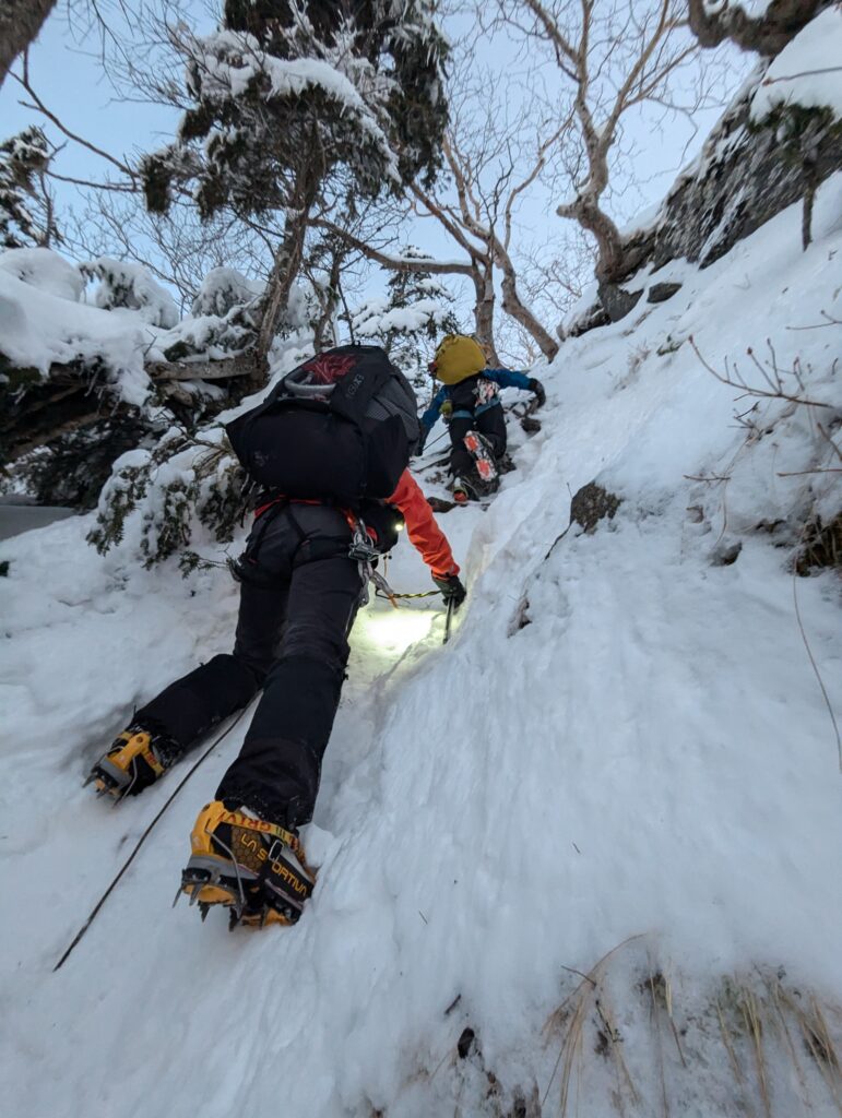第一岩峰は左から登った。さらさら雪の急斜面で慎重にステップ刻んだり灌木掴んだり。