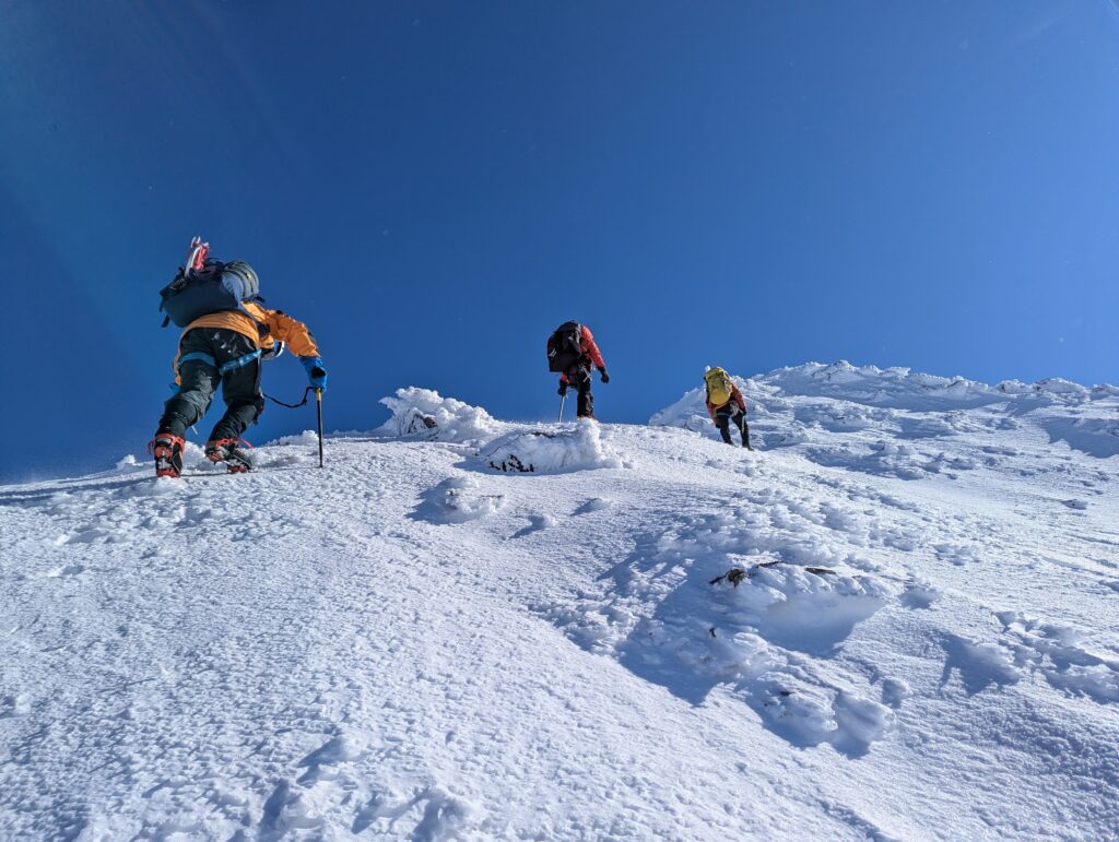 この時期の不安定な雪質の岩稜帯はアックスアイゼンが効きづらく、足場となる雪も崩れるので難しいなと改めて感じた。ルーファイしながら先頭でガンガン突っ込んでいく林さん、齋木さんの偉大さ。山頂まで一緒に登ったソロの男性が「実は穂高平小屋で登るのやめて帰ろうかと思っていたんです。あなた達が来てくれてよかった。お会いできて本当に良かったです。」と話していて、私も心の中で(わかる〜)と共感していた。