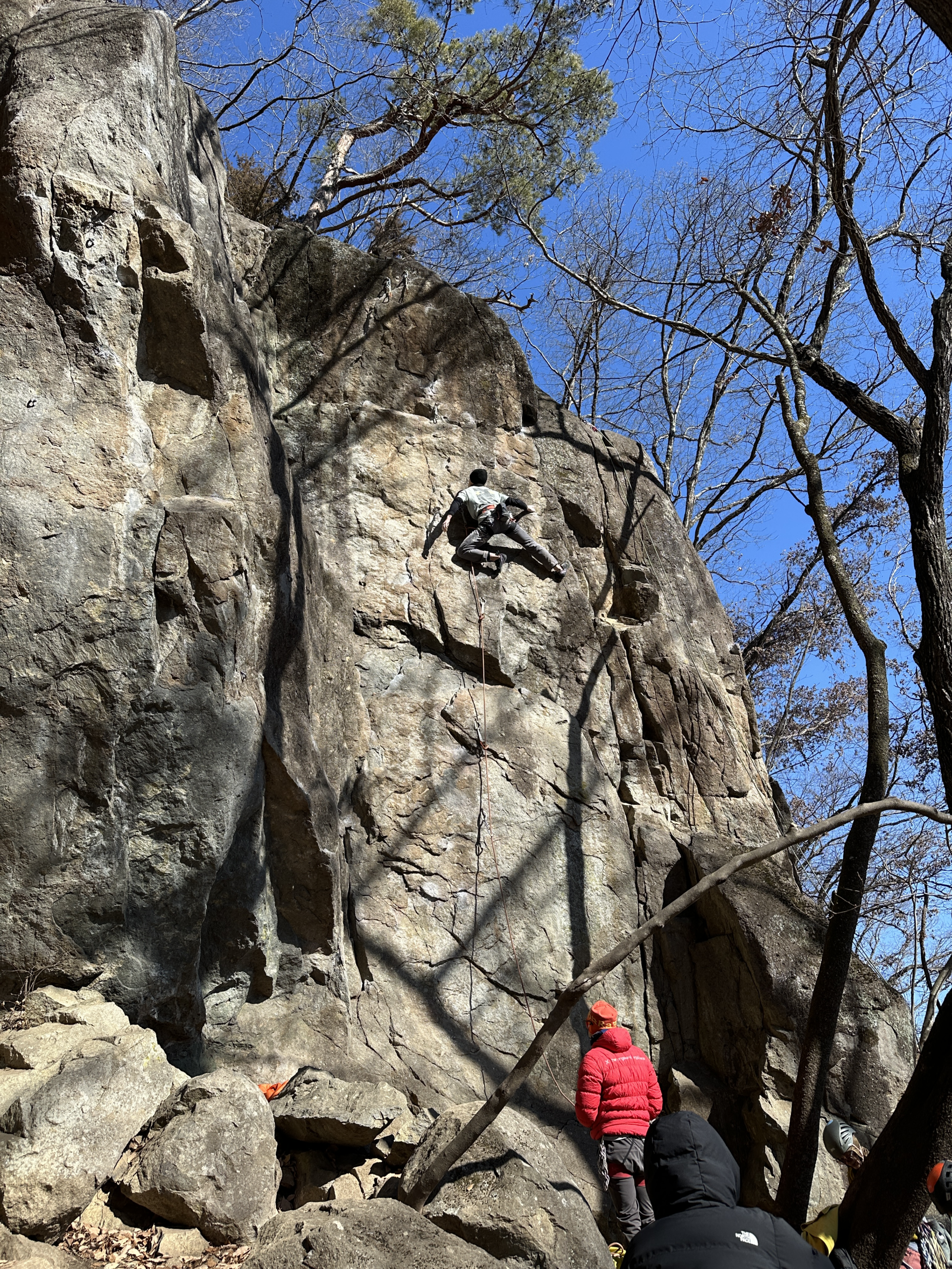 クラックルート。田中さんのナチュプロリード見た後にTRでカム回収をやらせてもらいながら登った。最後のハングでフォール。ハング上は期待してはいけない。長いルートは怖いけど楽しい。クラックに手を突っ込んで固めてバチっと止まる感覚は気持ち良い。
