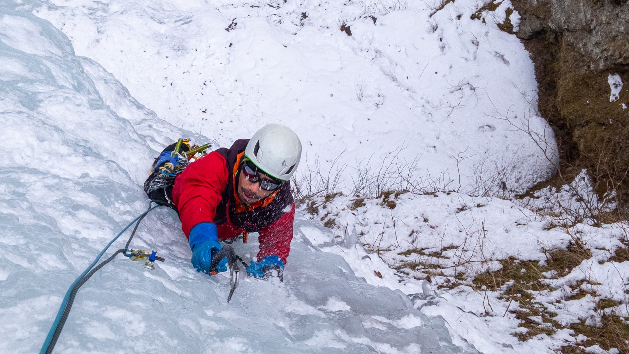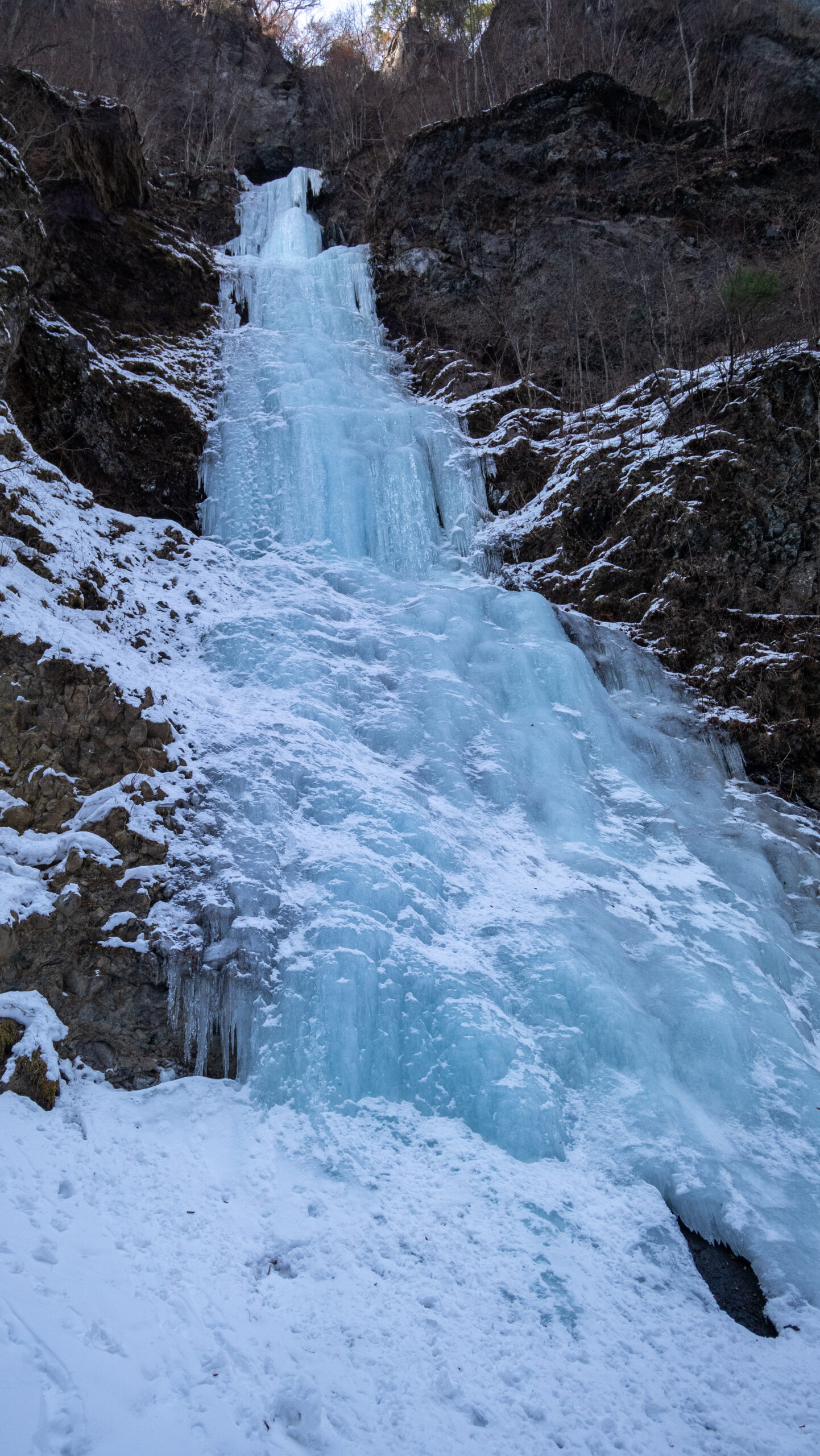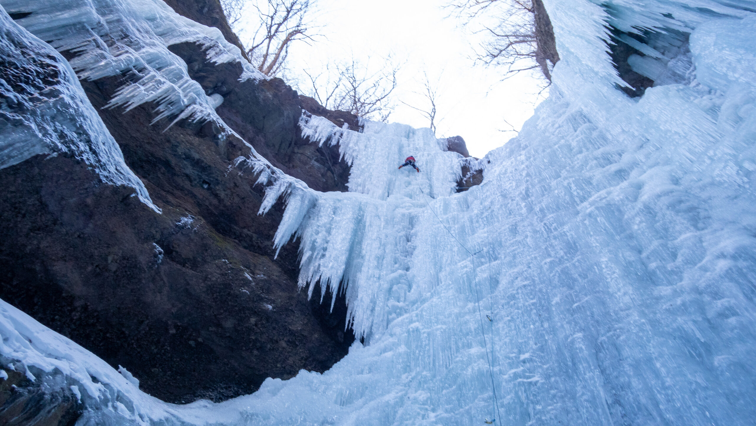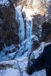 2日目は暗黒峡の「チャンピオン」に2人1回ずつトライ。上部垂直部がデコボコで脆く、スクリューを打つとスカ氷とピリつくコンディションだったが、落ち着いて前腕をパンプさせながら登り、きっちりノーテンでトップアウト。自信につながるいいトライができて満足。そして上から俯瞰してみた暗黒峡の景色には感嘆の声が出てしまうほどのものだった。