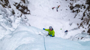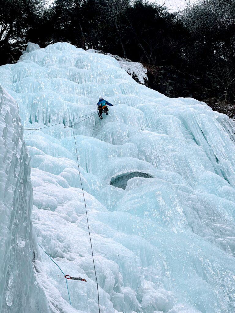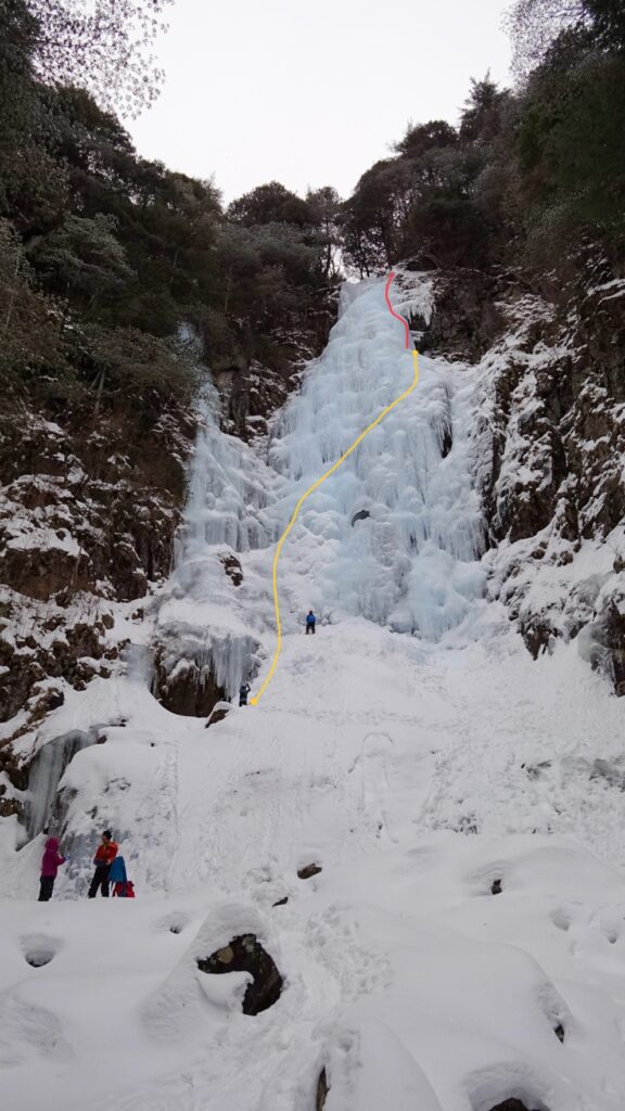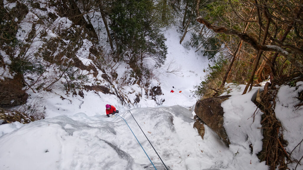 男滝から5分ほど歩いたところにある女滝。男滝より立っている気もするが、氷の状態がよく快適なクライミングで2p。下降は60m懸垂下降一回。