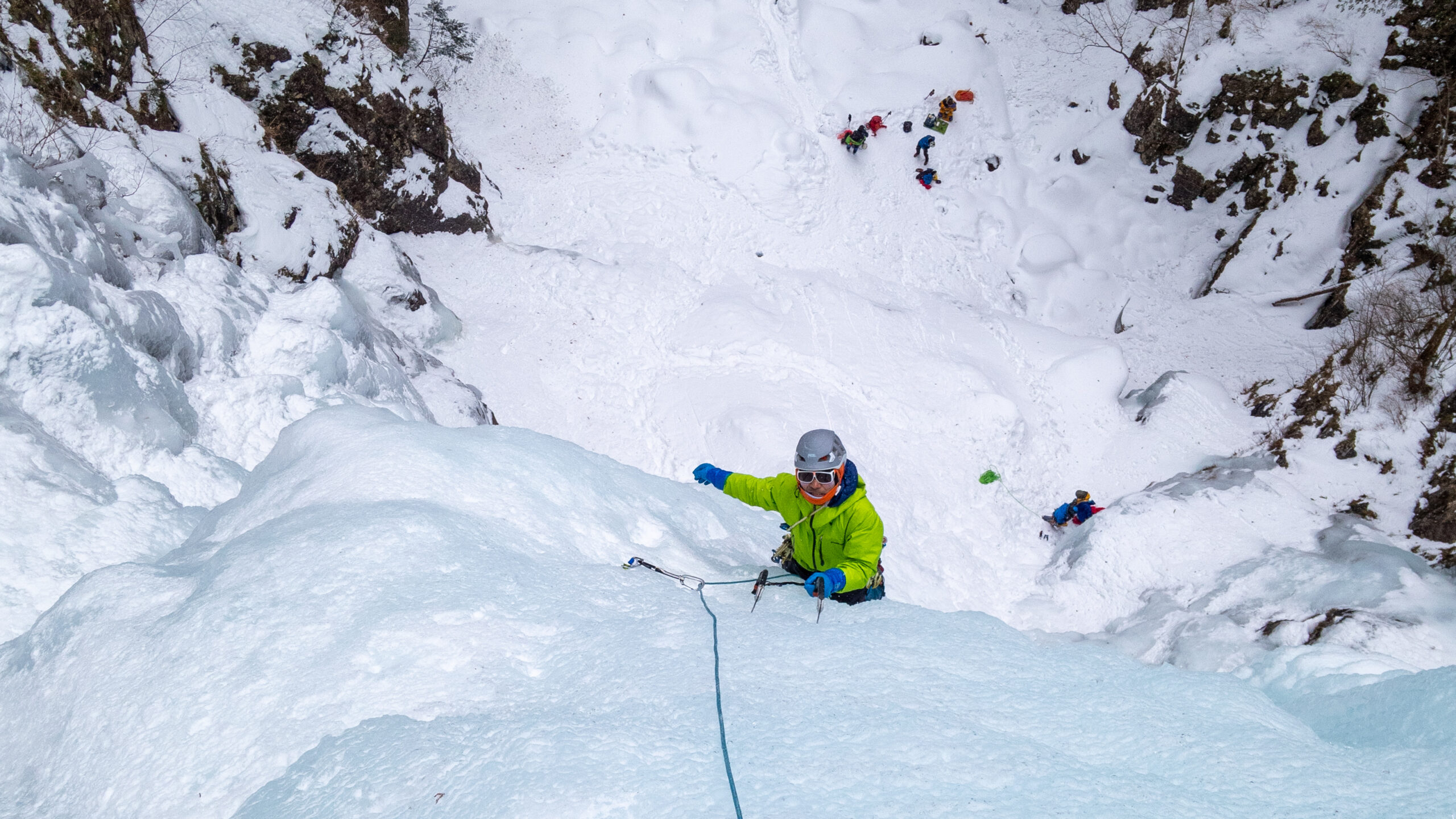 1p目で氷の状態の見極めで疲れたので、2p目は結氷良さそうな立っているラインを敢えて登った。落ち口に着く頃にはふくらはぎパンパンの激痛。トップアウトして2人をビレイしている頃、「いいクライミングだったなー」という充実感がじんわり湧いてきた。