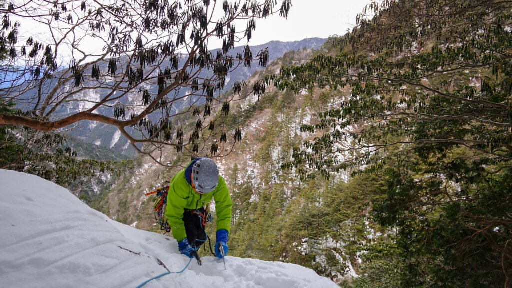 取り付いてみると乗った雪が氷化している箇所が多く、その氷は踏んでいる感がなくて気持ち悪い。その先のトラバースは露出感を感じて楽しかったが、氷の状態が各パートで異なるので気を遣うクライミングが続いて疲れた。