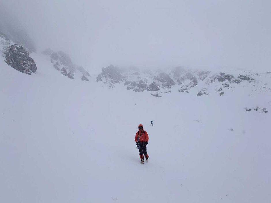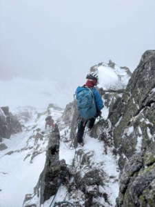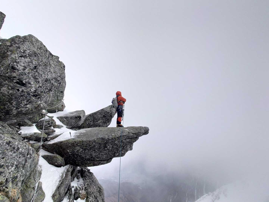 サギダル尾根の取り付きまでは40度ほどの急傾斜が続き、ふくらはぎがかなり悲鳴を上げました。取り付きに着いてロープを出し、いよいよ登攀開始です。それほど難しくないという事前情報でしたが、雪と岩のミックスはなかなかスリリングで、一歩踏み出すたびに緊張が走りました。