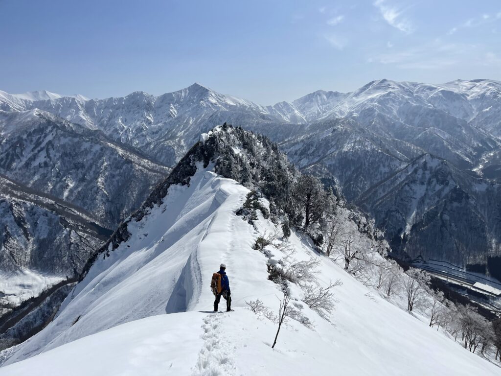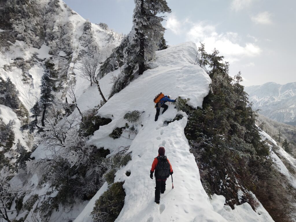 荒沢山からアイゼンに替えて、足拍子まで稜線歩き。天気も回復してきて、痩せ尾根の高度感はたまらなく楽しい!低山にしては、なかなかの映え稜線にテンションあがります。