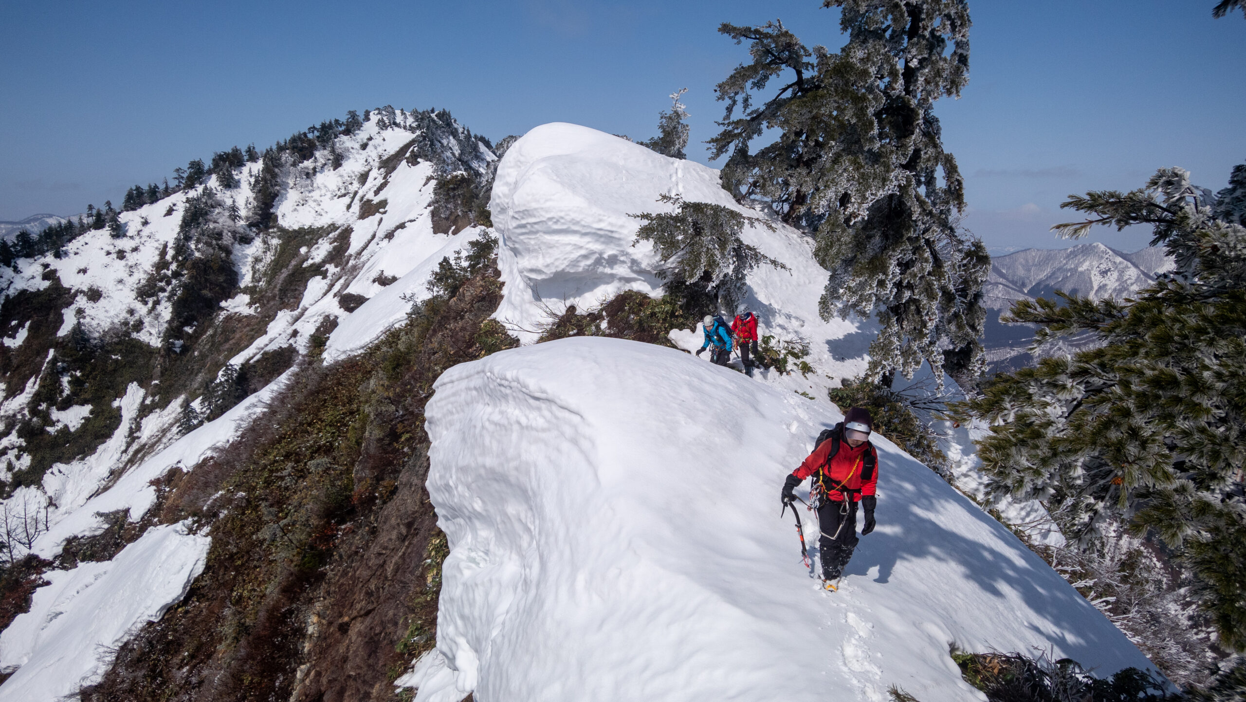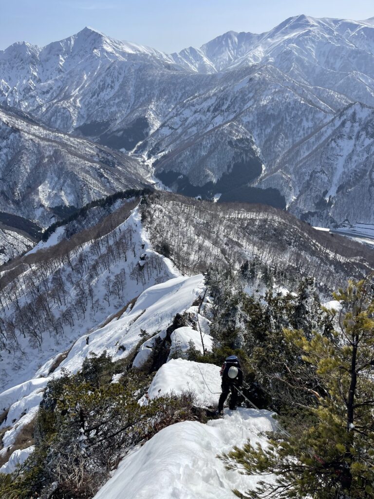 下山では雪が切れて岩が出ているところを懸垂下降、岩がもろいトラバースもビレイしてもらい、思ったより時間がかかりました。齊木さんと国府谷さんの支点作りやビレイをたくさん観察できたので、自分としてはとても勉強になりました。