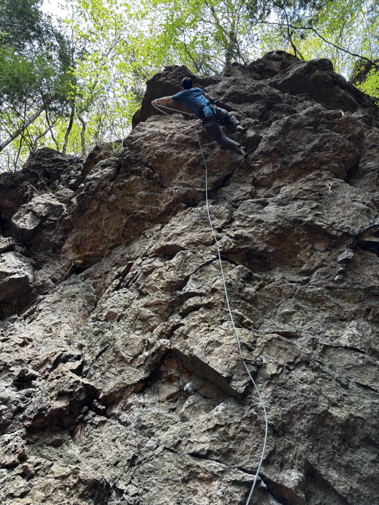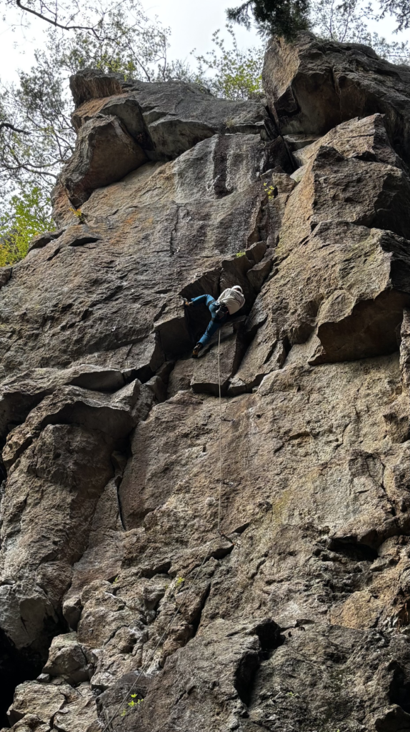 今回の自分の登りたかった課題。4月1週目に行ったびしょ濡れ有笠タワーでこのルートを見た時は登れる気が全くしなかった。それから小川山、有笠と行ってグレードも更新できてたのもあってか今回はなんか登れそうに見えた。オブザベをしっかりしてマスターで。トポにガバみたいなところは裏切らないと書いてあったので、それを信じてガバっぽいところは思い切りよく掴めた。ハング、レストを2セット。レストがしっかり取れるのでパワーを使う箇所もあるが戻せた。ガバがしっかりガバなので少しダイナミックに勢いよく身体を上げていくのが個人的にとても面白かった。上部に行くとスラブ。乗越す箇所は足上げて、バランシーでそれも面白かった。MOSグレード更新!