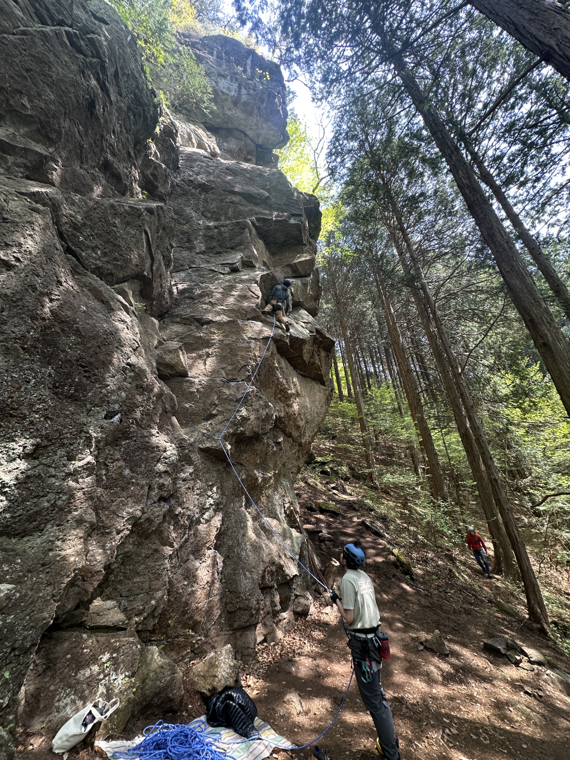 黒猫危機一髪から分岐して左上。核心で1発4級程度のムーブを求められるような感じ。核心までは手を温存できるので、ムーブを見つけて3便でいけた。カチが持てるかが核心。ハング上は終了点左右にざらざらのスローパー的なのがあって左をとれたら安定してクリップできた。自分でもいけたので手頃だと思う。林先輩、自分、塩田さんが続いてRPしてとても気持ち良かった。